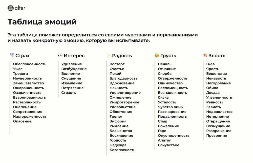 Как работает: представляет собой список основных эмоций и их оттенков в различной степени. Таблица чувств помогает классифицировать эмоциональные состояния и понимать, к какой группе они относятся.