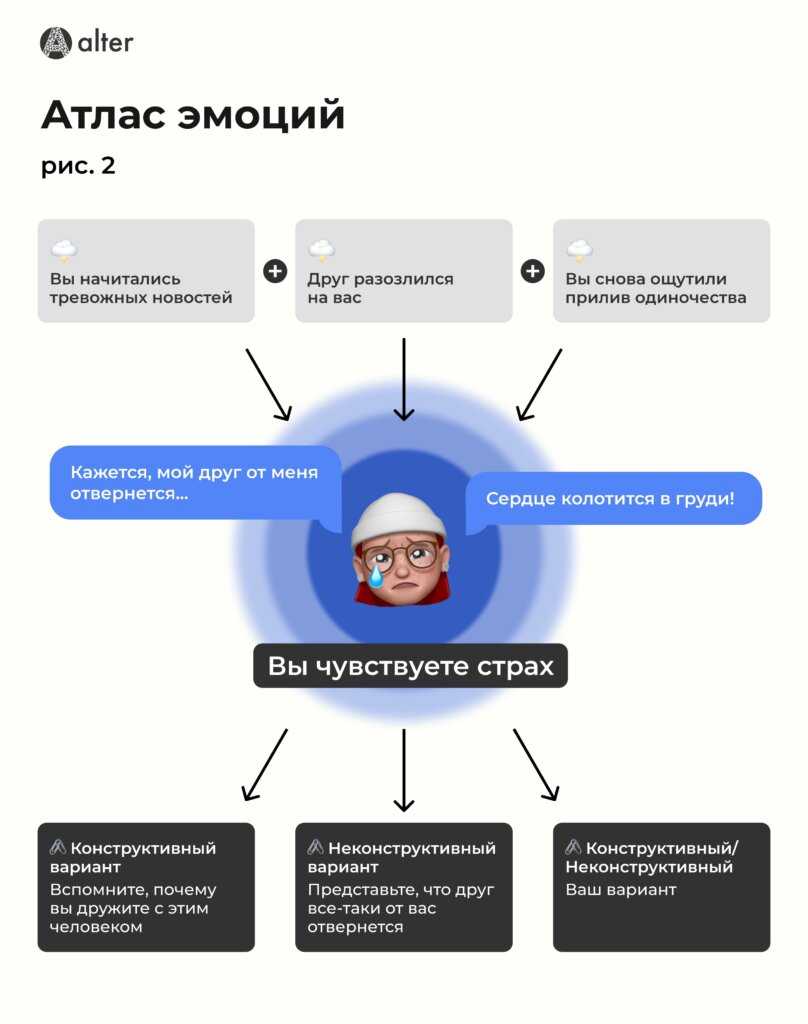 Как работает: интерактивный проект для развития эмоциональной осознанности. Цель — помочь разобраться с тем, что триггерит сложные переживания и научиться находить для них конструктивный выход. Атлас не только предлагает познакомиться с пятью основными эмоциями, но и изучить стратегии для преодоления негативных чувств, которые они могут вызывать.