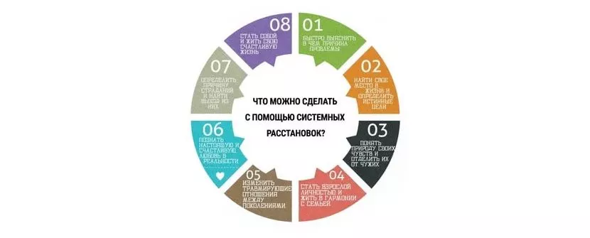 Установка Хеллингера служит простым методом, помогающим людям осознавать общность их проблем. С помощью расстановок участники программы могут избавиться от множества надуманных проблем, ментальных убеждений, раскрыв их первопричины. Как правило, ими являются разрушающие семейные программы и незаконченные проблемные ситуации в семье, оказывающие отрицательное влияние на судьбу человека. С помощью расстановок Хеллингера возможно раскрыть первопричины: