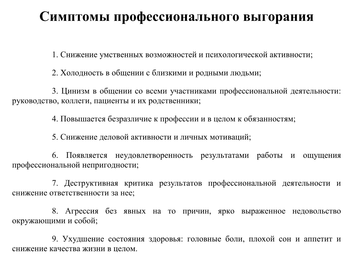 Профессиональное выгорание — это постоянное пребывание в состоянии стресса, который включает рост негативной оценки самого себя, вызывает отрицательные чувства к работе, проявления безразличия и цинизма по отношению к больным и их родным.